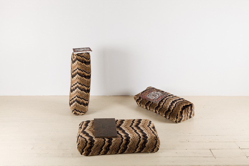 Brown is the colour of dark wood, cushions, enamel, oil and gouache on canvas and canvas board, 2014