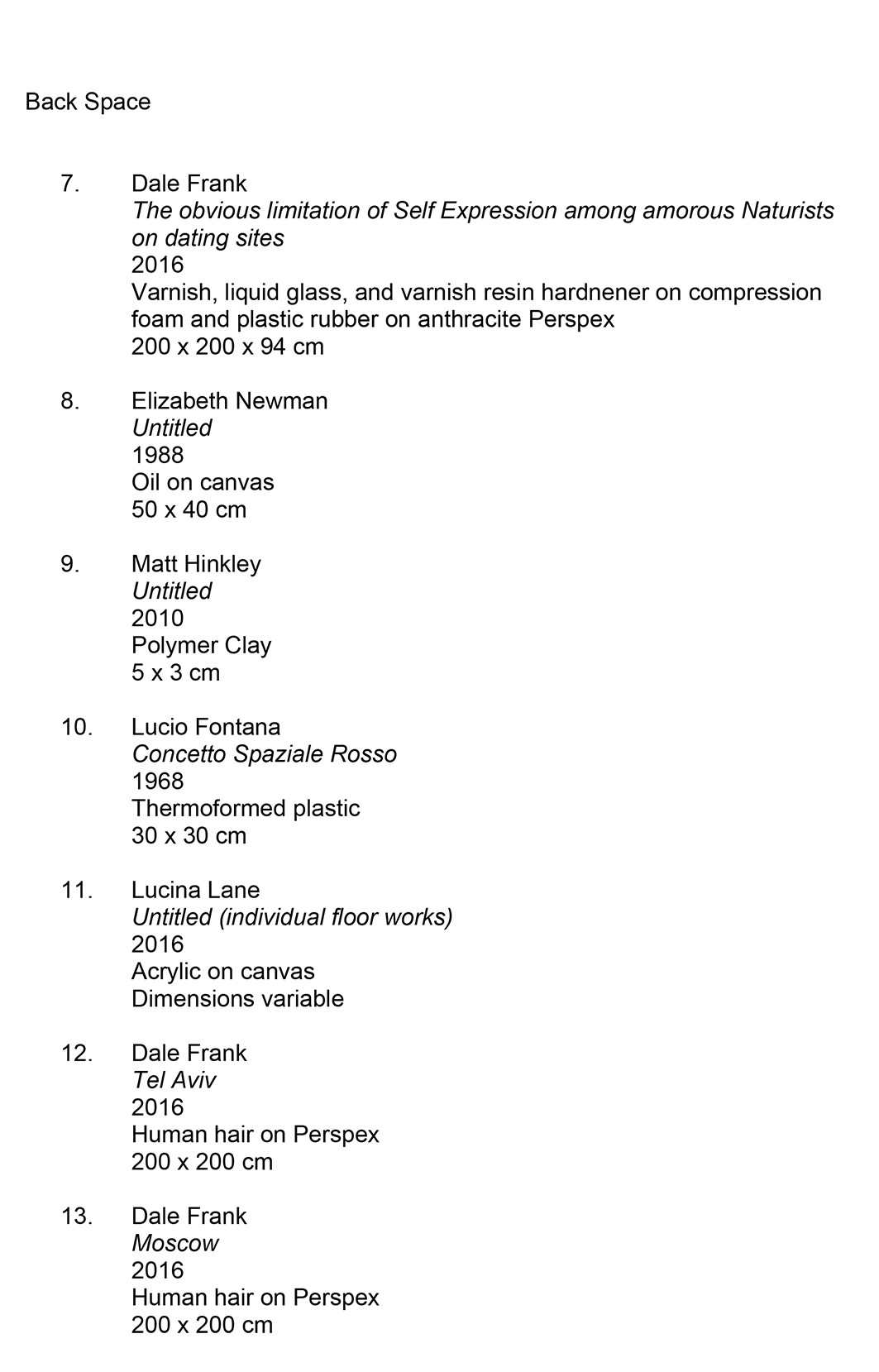 Dan Arps, Janet Birchill, Dale Frank Lucio Fontana, Julia Gorman, Matt Hinkley, Imi Knoebel, Lucina Lane, Elizabeth Newman David Palliser